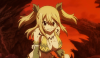 Magic Sensor: Lucy has shown to be able to sense Magic to a certain extent. This was first seen when she was battling against the Nine Demon Gates in Alegria, being able to sense all her comrades Magic despite being ensnared by the monster.[102] After the one year time skip, during the Grand Magic Games, she was able to sense that the members of Scarmiglione were easily more powerful than their opponents, despite their efforts in hiding their strength, and could quickly tell that the intruder was much more stronger and dangerous before he even displayed his power.[103]